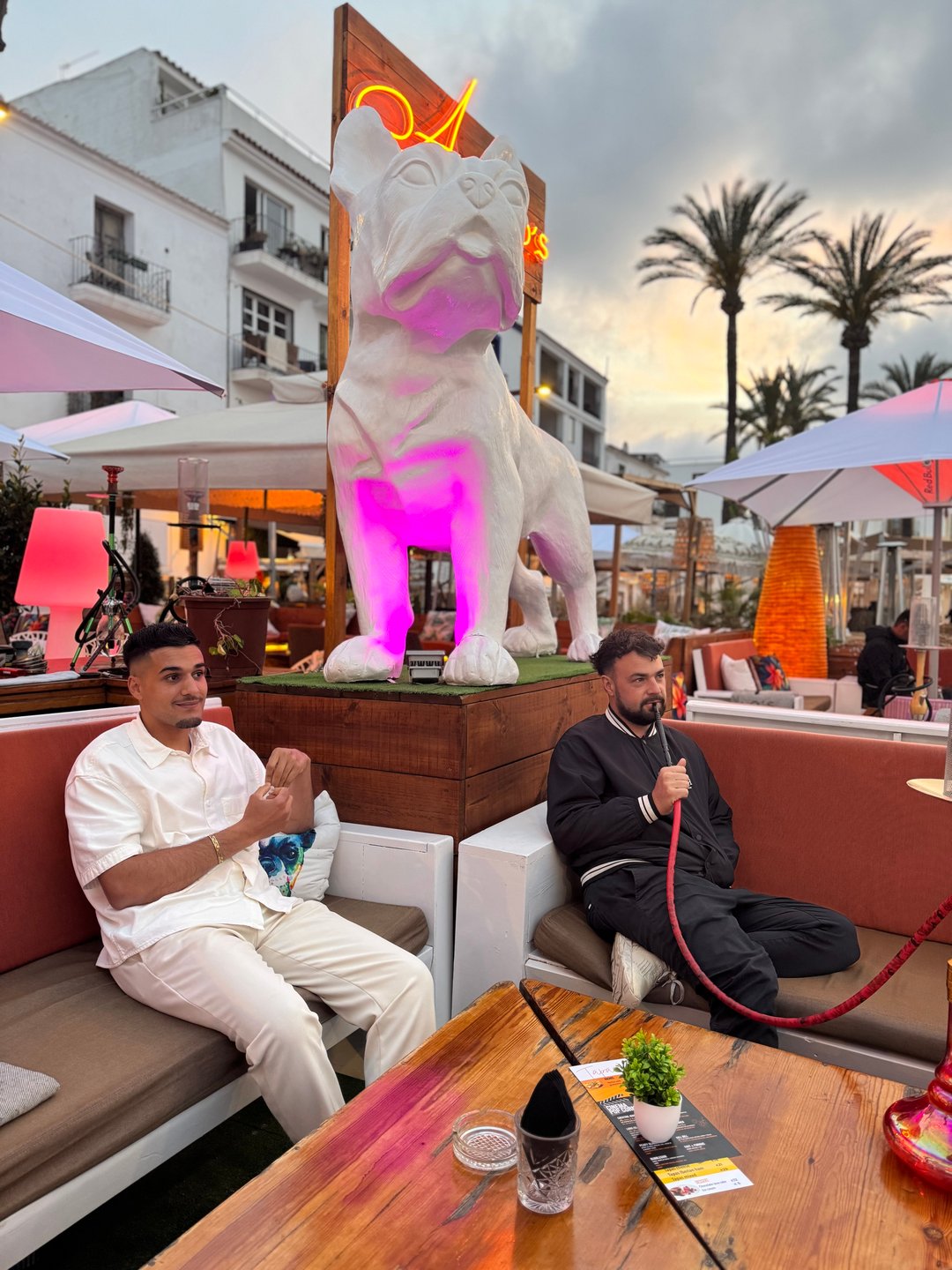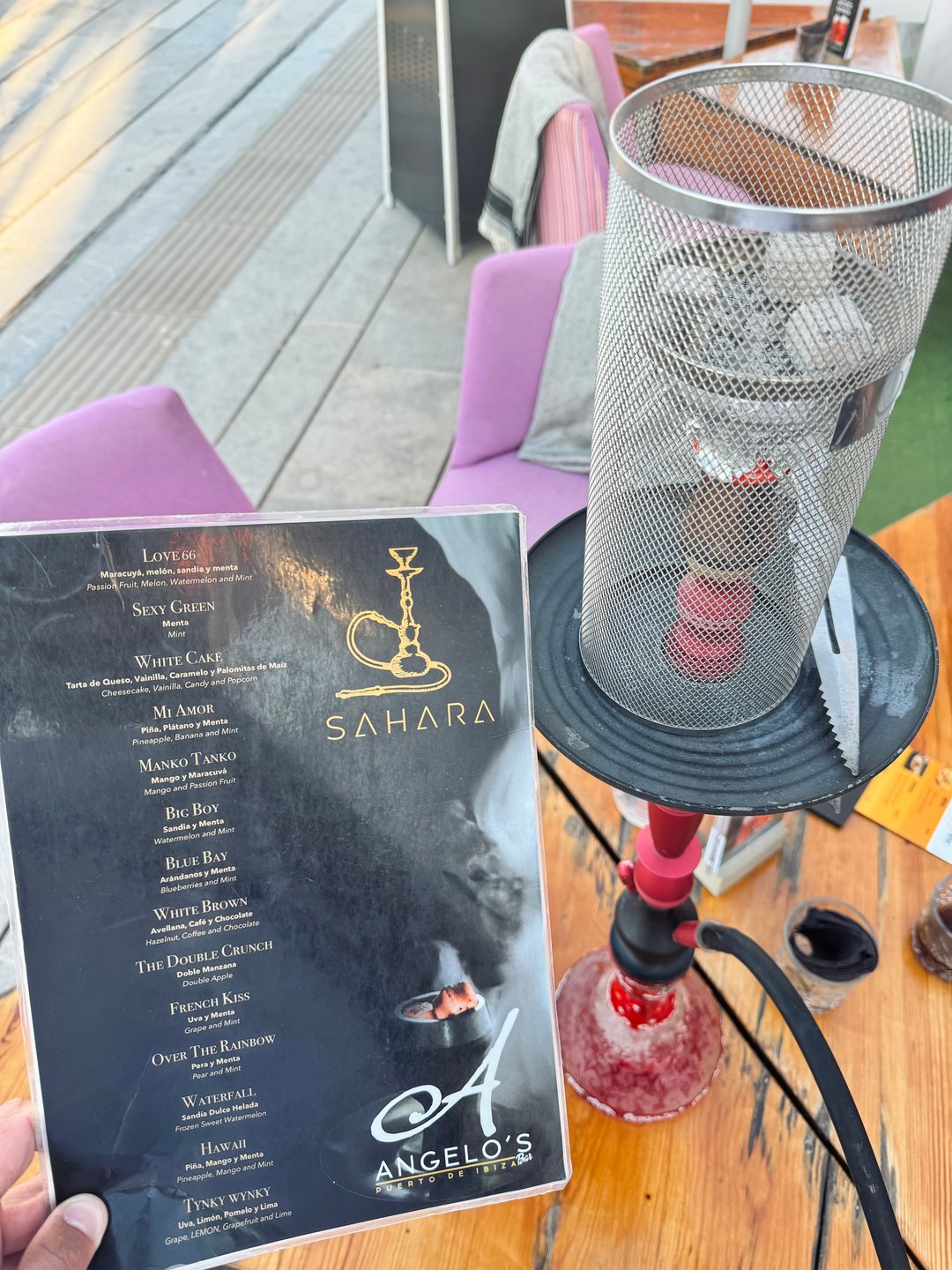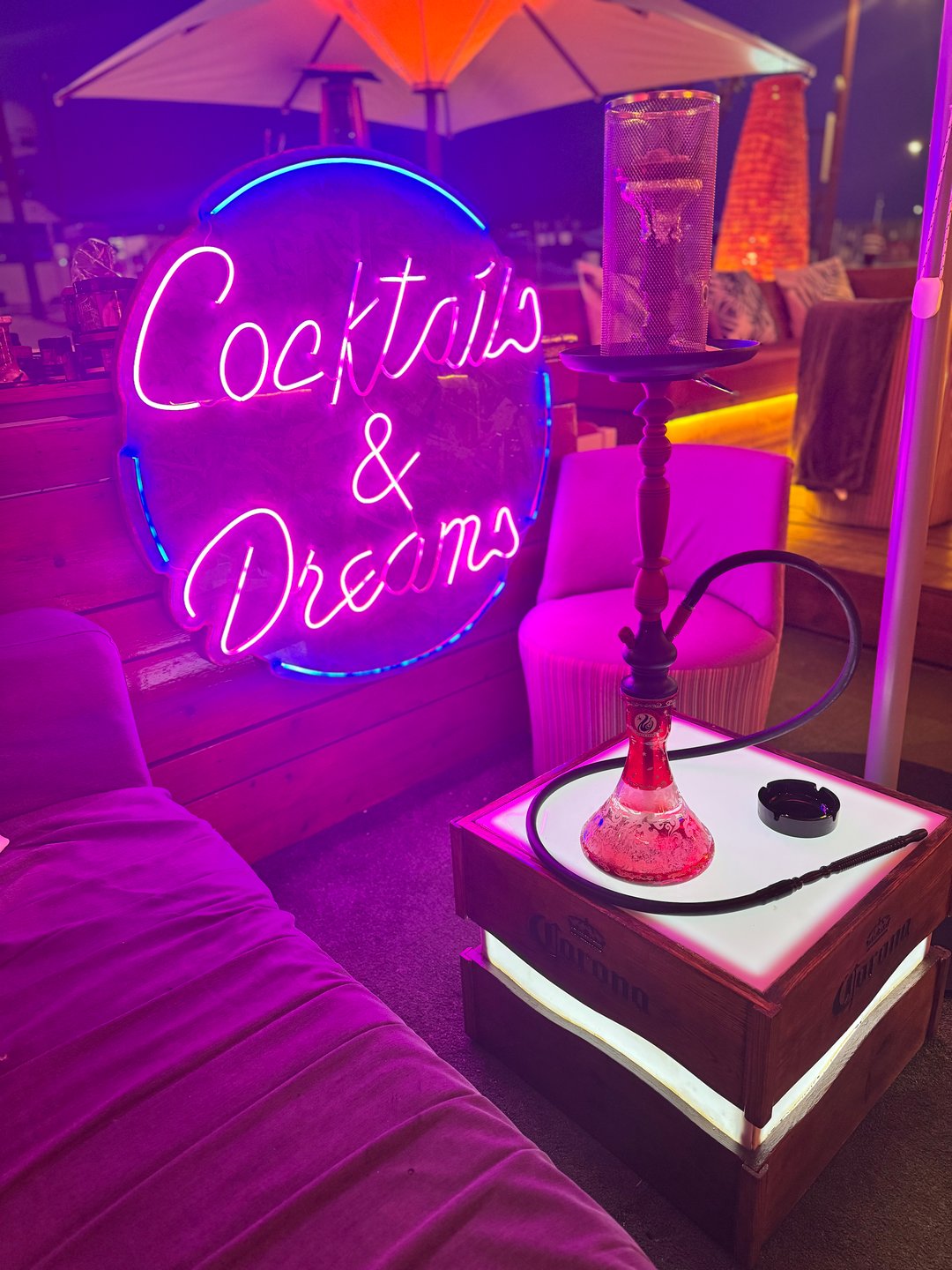 Somos un bar en pleno puerto de Ibiza, podrás disfrutar nuestros cócteles, deleitar nuestras tapas y fumar una shisha en un ambiente único frente al mar. Ideal para disfrutar una tarde entre amigos mientras el sol se pone y la noche comienza a cobrar protagonismo. Aquí encontrarás la previa ideal si lo que buscas es diversión al mejor estilo de Ibiza. Para aquellos que optan por las mañanas tranquilas pero con encanto y estilo ofrecemos desayunos y zumos naturales desde las 10 de la mañana donde encontrarás un ambiente agradable y relajado. Nuestras puertas están abiertas desde las 10 Am hasta las 4 Am cada día Te esperamos !